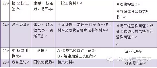 (1)進(jìn)行工程質(zhì)檢,出據(jù)質(zhì)檢報(bào)告; (2)進(jìn)行消防、安全、環(huán)保、壓力容器等單項(xiàng)驗(yàn)收,并出據(jù)單項(xiàng)驗(yàn)收?qǐng)?bào)告、危險(xiǎn)化學(xué)品安全評(píng)價(jià)報(bào)告、防雷防靜電檢測(cè)報(bào)告、環(huán)保評(píng)價(jià)檢測(cè)報(bào)告書(shū); (3)在安監(jiān)部門辦理化學(xué)危險(xiǎn)品經(jīng)營(yíng)許可證、在質(zhì)監(jiān)局辦理壓力容器使用許可證、充裝注冊(cè)登記證; (4)質(zhì)檢部門對(duì)加氣機(jī)進(jìn)行校驗(yàn)標(biāo)定,出據(jù)計(jì)量使用許可證; (5)員工到有關(guān)部門進(jìn)行技術(shù)培訓(xùn),取得上崗證; (6)試運(yùn)行、驗(yàn)收整改、完善; (7)綜合驗(yàn)收前:建設(shè)單位準(zhǔn)備申請(qǐng)竣工驗(yàn)收?qǐng)?bào)告、相關(guān)批準(zhǔn)文件、設(shè)計(jì)資料、施工資料、竣工資料、質(zhì)檢資料、監(jiān)理資料、材料試驗(yàn)資料、財(cái)務(wù)決算資料、管理制度、事故處理應(yīng)急預(yù)案等相關(guān)資料。 (8)主管部門主持,建委、規(guī)劃、消防、環(huán)保、安辦、質(zhì)監(jiān)、專家及設(shè)計(jì)、建設(shè)單位參加進(jìn)行竣工驗(yàn)收?qǐng)?bào)告; (9)在行業(yè)管理部門辦理燃?xì)饨?jīng)營(yíng)許可證、公商行政管理局辦理營(yíng)業(yè)執(zhí)照、燃?xì)夤芾聿块T辦理燃所資質(zhì)證; (10)投產(chǎn)經(jīng)營(yíng)。